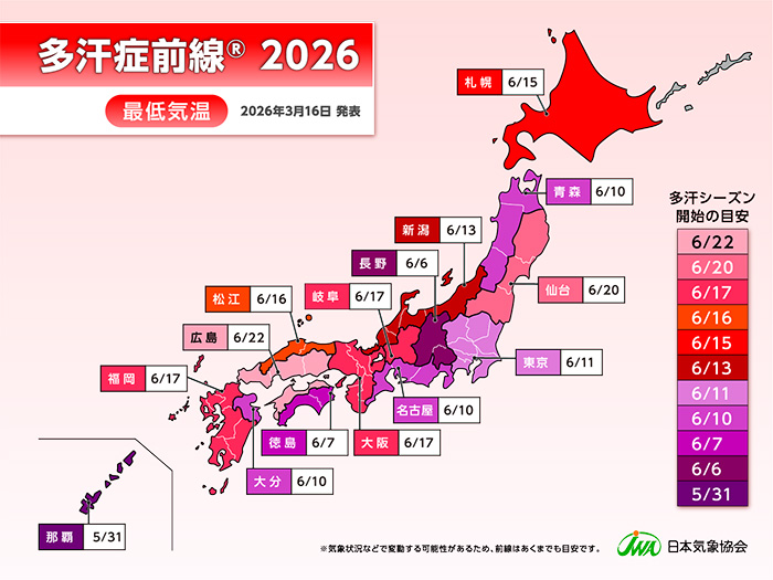今年も多汗シーズンの「はじまりの日」を、全国15地域で予測しました。 あなたの街には、いつ届きますか?